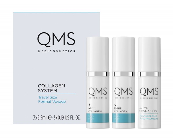 QMS Medicosmetics Collagen System 3-step TRAVEL met een vernieuwde formule van het collageen en fruitzuur! Deze is nog krachtiger en met nog meer resultaat! Dit Collageen bevat een opnieuw gepatenteerde formule waaraan meervoudig Hyaluronzuur en Honing Liposomen zijn toegevoegd. Deze nieuwe werkstoffen zijn zeer fijn van structuur en worden nog beter in de huid opgenomen.